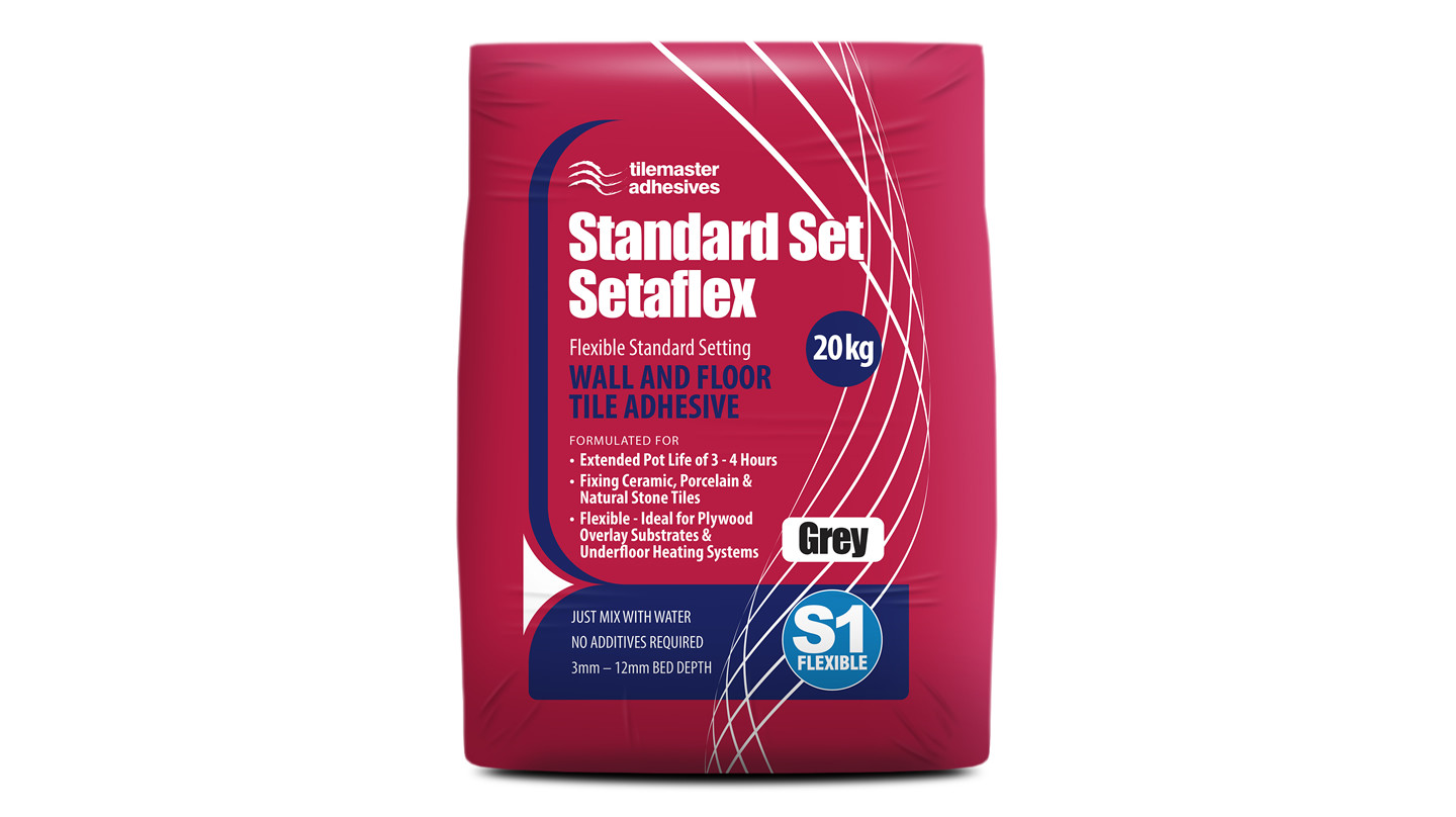 Tilemaster Standard Set Setaflex has been specially formulated for fixing a large variety of tiles including ceramic, porcelain and natural stone tiles to substrates subject to limited movement and/or vibration such as plywood overlay, timber framework and underfloor heating systems as well as for fixing to solid substrates such as concrete and sand/cement screed.