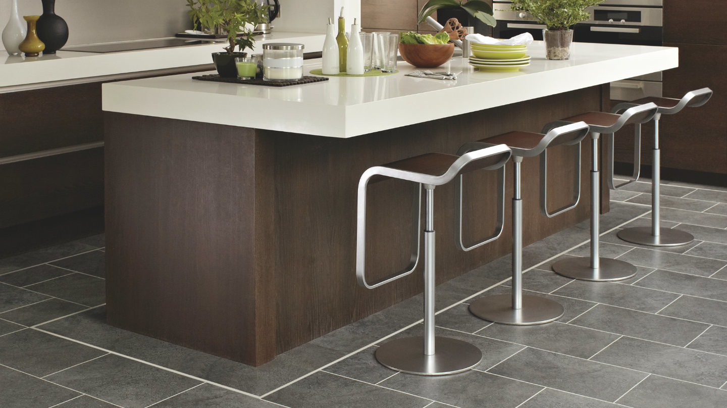 One of the darkest tiles in our Knight Tile collection, Cumbrian Stone, combines smoky charcoal and carbon tones in a contemporary wider scale 18×12” tile format. Because of its darker colouring and durability, this floor is very practical for pets, and is easily personalised with corresponding design strips and Mosaic or Macintosh borders.