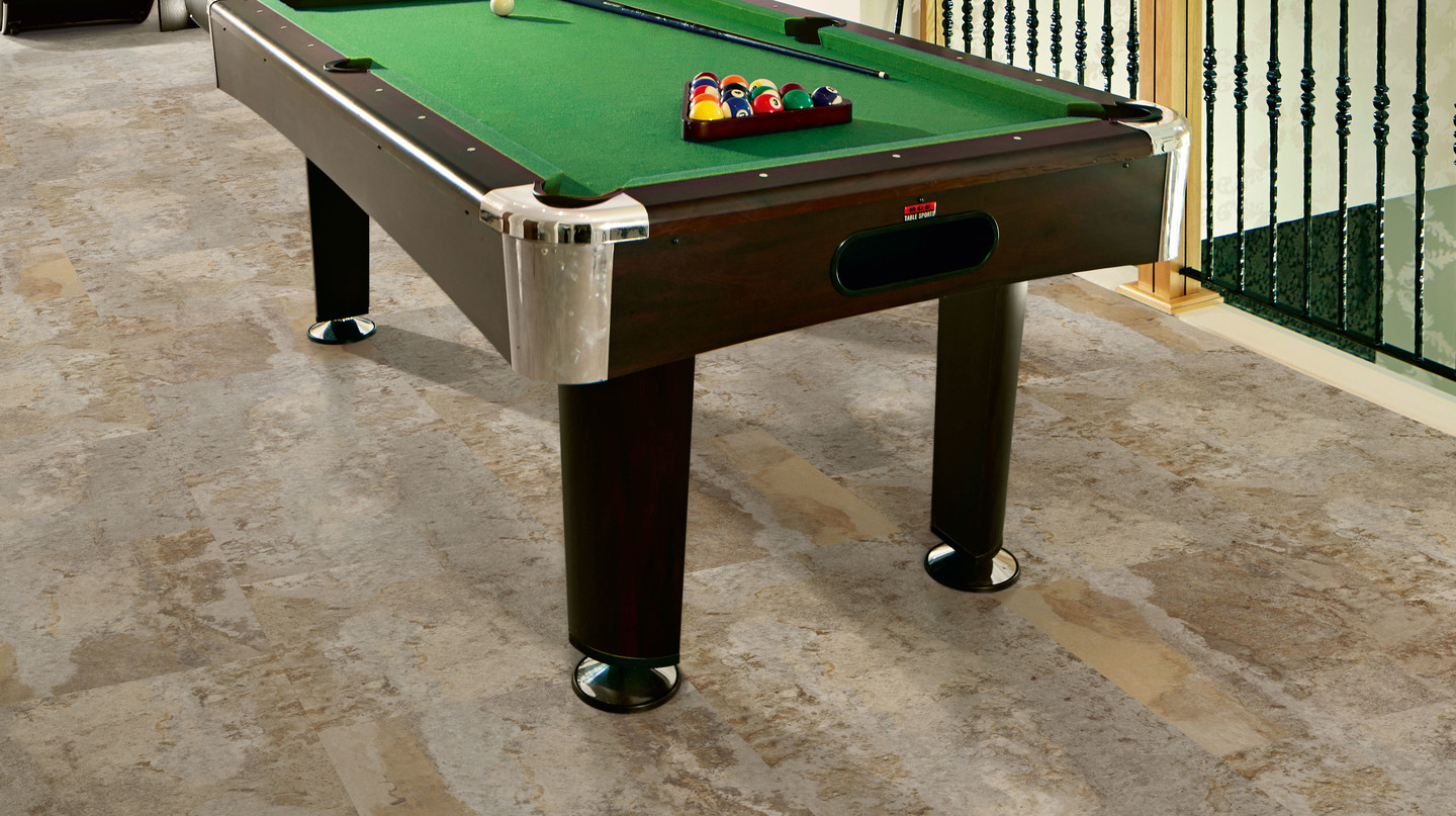 Featuring cool gray and light brown tones, our new Georgia Karndean LooseLay slate look stone tile. With its innovative K–Wave friction grip backing, Karndean LooseLay is ideal for installation over most existing hard floors with little or no need for adhesives, meaning it’s faster and easier to fit and repair.