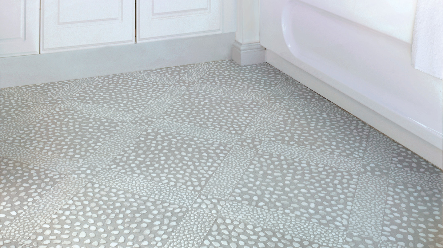 Andalucian Opal has all of the tactile beauty of the other Spanish Pebble designs in this Iconic collection. But for a really pretty look, each 12” x 12” tile comes pre–formed with a wide border and corner detail composed of smaller pebbles, increasing the overall size to 15” x 15”.